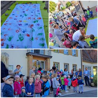 Zu Beginn des Kindergartenjahres haben wir in der Kita Spatzennest Fahnen mit bunten Handabdrücken der Kinder bedruckt. Jedes Kind durfte seine Hand in bunte Farben tauchen und einen Abdruck auf der Fahne hinterlassen. Diese Fahnen stehen symbolisch für die Vielfalt und Einzigartigkeit jedes einzelnen Kindes. Die bunten Hände machen sichtbar, dass alle Kinder das Recht haben, gehört zu werden und Teil einer starken Gemeinschaft zu sein.