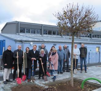 Bei der offiziellen Übergabe dankte Bürgermeister Bernd Rebhan den Spendern für die Bereitschaft, die Begrünung des neuen Pausenhofes zu unterstützen. Die nun ausgewählten Kugelahorne sind Teil der Außenanlagenplanung und fügen sich gut in das neue Schulgelände ein, spenden künftig Schatten und tragen zur Verschönerung des Pausenhofs bei. Besonders hob er das Engagement der Vereine hervor, die mit Vereinsgeldern die Gestaltung des neuen Pausenhofes unterstützen. Er wünschte den Bäumen mit der gesamten Schule und allen Menschen, die sich hier für den Nachwuchs einsetzen, ein sprichwörtliches „Blühen, Wachsen und Gedeihen“. Bis Ende des Jahres würden die Arbeiten am neuen Pausenhof abgeschlossen.