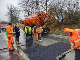Die letzten Teilstücke der Asphaltdeckschicht bauten die Mitarbeiter der Firma Schmittnägel in Handarbeit ein. Bürgermeister Bernd Rebhan (Zweiter von links) dankte den Bauarbeitern der Firma für die zügige Abwicklung der gesamten Maßnahme.