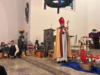 Die Kinder des Kindergarten Johannisthal luden ihre Eltern zu einem gemeinsamen Adventsstündchen ein. Wir zündeten die erste Kerze unseres Adventskranzes an und sangen dabei „Eine Kerze leuchtet weit“. Mit einem Nikolaus Fingerspiel begrüßten wir Herrn Diakon Fischer, der uns vom heiligen Bischof Nikolaus aus Myra erzählte. Dann gestalteten die Kinder zur Musik vor dem Altar mit vielen Häusern und Tüchern die große Hafenstadt. Anschließend sahen wir uns auf der Leinwand die Geschichte vom Kornwunder an. Zum Schluss gab es vom Nikolaus noch für Jeden eine Überraschung und alle sangen „Lasst und froh und munter sein“. Vor der Kirche ließen wir bei Plätzchen und Punsch unsere gemeinsame Zeit ausklingen.