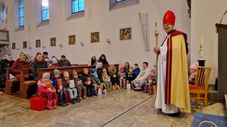 Unser Kindergarten feierte eine stimmungsvolle Nikolausfeier in der kath. Kirche. Alle Familien trafen sich, um gemeinsam ein gemütliches Stündchen miteinander zu verbringen. Auch Diakon Fischer begleitete uns durch den Nachmittag. Gemeinsam stimmten wir fröhliche Adventslieder an, legten aus vielen Zweigen einen großen Adventskranz und zündeten die erste Kerze an. Herr Diakon Fischer zog das Gewand an, seine Mytra und wir hörten die Geschichte vom heiligen Nikolaus mit Bildern. Natürlich verteile der Nikolaus auch Geschenke an alle Kinder und wir bedankten uns zum Schluss mit einem fröhlichen Nikolauslied. Anschließend wartete vor der Kirche auf alle Familien Kinderpunsch, Glühwein und viele Plätzchen.