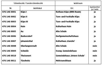 | 3. | Die Briefwahlvorstände (Nr. 476 146 0021 bis 0024) treten zur Ermittlung des Briefwahlergebnisses ab 15.30 Uhr für die Briewahlbezirke Küps I bis IV im Rathaus Küps, Am Rathaus 1; 96328 Küps (Sitzungssaal, Sitzungszimmer, Trauungszimmer, Ratskeller) zusammen. | |