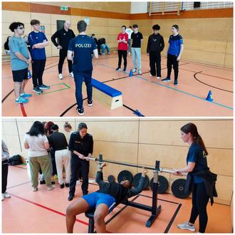 Und so kam es zum Großeinsatz am letzten Montag: Über die Recruiting-Abteilung des Polizeipräsidiums Oberfranken vereinbarte die Klassenlehrerin der VK2, Frau Söllner, den Termin. Die drei Beamten aus Bayreuth brachten das ganze Equipment mit, damit die Schülerinnen und Schüler der 9. Klasse und der VK2 ihr Können testen konnten. Nach einer kurzen theoretischen Einführung gab es ein Aufwärmtraining. Anschließend wurden die beiden Klassen in zwei Gruppen aufgeteilt, getrennt nach Mädchen und Jungen. Während sich die Mädchen beim Bankdrücken ausprobieren durften, beschäftigte sich die andere Gruppe mit dem Kasten. Danach wurde getauscht. Auch die beiden anwesenden Sportlehrer, Frau Einbecker und Herr Schmidt, konnten sich ein Bild von den sportlichen Anforderungen der bayerischen Polizei machen.