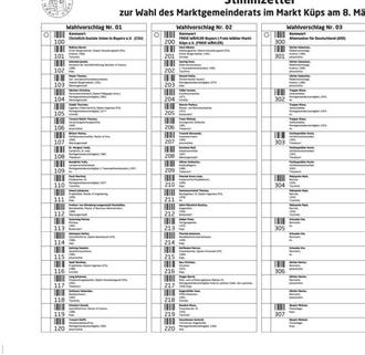 | 3. | Die Briefwahlvorstände treten zur Ermittlung des Briefwahlergebnisses um 15.00 Uhr in Ihren Wahllokalen zusammen (Rathaus Küps, Am Rathaus 1, 96328 Küps: Briefwahl I: Sitzungssaal, Briefwahl II: Sitzungszimmer, Briefwahl III: Trauungszimmer, Briefwahl IV: Ratskeller | Briefwahl V + Briefwahl VI: Mehrzweckraum Schule Küps – Aula, Am Hirtengraben 7, Küps | Briefwahl VII + Briefwahl VIII: Probenheim SBO, Zettlitzweg 25, Küps). |