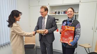 Extra für die beiden Konzerte ist die Sopranistin Sung-Ah Kim aus Seoul/Südkorea angereist. Sung-Ah Kim ist eine Studienfreundin der Küpser Cellistin Ulrike Maria Gossel; die beiden haben gemeinsam ihr Musikstudium an der Universität Mozarteum Salzburg absolviert. Die Musik von Adolph Kurt Böhm hat Sung-Ah Kim fest ins Herz geschlossen: "Seine Werke sind wirklich wunderschön! Frisch und doch vertraut! Ich bin glücklich und dankbar, sie singen zu dürfen." Erster Bürgermeister Bernd Rebhan hieß die sympathische junge Frau im Küpser Rathaus willkommen und dankte den beiden Musikerinnen für ihr Engagement für Adolph Kurt Böhm. Im Anschluss ließ er es sich nicht nehmen, mit ihnen gemeinsam die Ehrentafel am Geburtshaus des Komponisten zu besuchen.