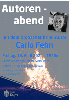 Der erste Autorenabend im Jahr 2024 im Oberen Schloss startet mit keinem Unbekannten. Der Kronacher Erfolgs-Krimiautor Carlo Fehn informiert über sein Gesamtprojekt und liest einige Stellen seiner bisher 16 Regionalkrimis. Der aus Hirschfeld stammende Autor ist bekannt für seine lebendigen Charaktere, kniffligen Rätsel und authentischen Ortsbeschreibungen, die den Leser direkt in die Handlung hineinziehen. Seine Bücher sind nicht nur spannend, sondern vermitteln auch ein starkes Gefühl für den Ort und die Menschen, die im Landkreis leben.