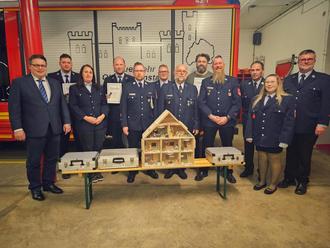 Jubilare, 2. Bgm., Kommandant, Mitglieder der Vorstandschaft und der Nachwuchsarbeit, Anschaffungen für die Kinderfeuerwehr aus dem Erlös der Tombola (Brandschutz- und Notrufkoffer, Rauchhaus)