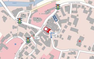 Bitte beachten Sie: damit kein Fahrzeug plötzlich „mitten auf der Kreuzung“ steht, muss hierfür die untere Ausfahrt aus dem Pfarrweg geschlossen werden. Eine Ausfahrt ist stattdessen über den Hirtengraben möglich (siehe Karte).