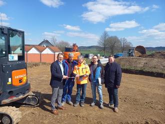 Am Ortsrand von Küps entsteht derzeit das kleine Baugebiet „Südlich der Ringstraße“, mit dem fünf neue Baurechte entwickelt werden. Dank des Entgegenkommens der Grundstückseigentümer konnte die Marktgemeinde Küps die rund 4600 Quadratmeter große Fläche erwerben und mit einem Bebauungsplan fünf Bauwerbern die Möglichkeit zur Schaffung von Einfamilienwohnhäusern ermöglichen. Die Firma STL aus Sonneberg führt derzeit die Erschließungsarbeiten durch, die bis Mitte 2023 abgeschlossen sein sollen. Bürgermeister Bernd Rebhan dankte dem Unternehmen für die zügige Erledigung des Auftrages. Ein kurzes Straßenstück wird vom östlichen Arm der Ringstraße aus geschaffen, dazu werden Mischwasserkanal und Wasserleitung neu verlegt. Zwei neue Straßenleuchten werden gesetzt und die Voraussetzungen für einen Glasfaseranschluss mit der Verlegung von Leerrohren geschaffen. Richtung Ortsausgang wird das Baugebiet mit einem Grünstreifen, Hecken und Bäumen abgerundet. Um die Fläche zu erschließen, werden unter der Leitung vom Ingenieurbüro IVS aus Kronach rund 360.000 € investiert. Erstmals ist in diesem Baugebiet die Erzeugung von Strom oder Wärme mit Photovoltaik- oder Solaranlagen vorgeschrieben. Das Oberflächenwasser wird gesondert erfasst und belastet den Schmutzwasserkanal damit nicht.