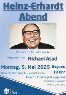 Liebhaber des feinsinnigen Humors aufgepasst: Michael Asad trägt Sketche und Texte des berühmten Komikers Heinz Erhardt vor. Freuen Sie sich auf einen Abend voller Sprachwitz, Schalk und zeitloser Komik. Mal verschmitzt, mal nachdenklich, aber immer mit einem Augenzwinkern.