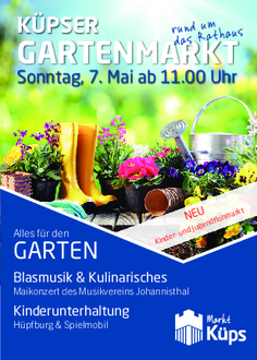 Neben einem attraktiven Markt gibt es dieses Jahr zum ersten Mal einen Kinder- und Jugendflohmarkt. Hier können die kleinen und großen Trödler alles anbieten, was im Kinder- und Jugendzimmer übrig ist. Um 11 Uhr eröffnet der Erste Bürgermeister Bernd Rebhan den Küpser Gartenmarkt.