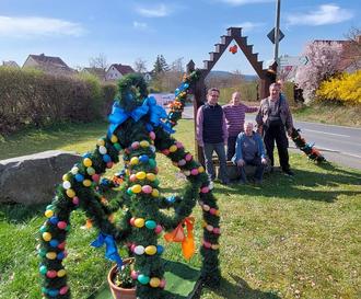 Die Mitglieder von „Tüschnitz aktiv“ schmückten auch in diesem Jahr das obere Ortsbegrüßungsschild mit Eiergirlanden. Auch die Osterkrone wurde wieder aufgestellt, ergänzt durch eine Pflanzschale.