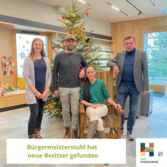 Familie Landwehr hat Stuhl ersteigert Auf dem Bild sind v.l.n.r.: Melanie Abel (Stadtbibliothek), Bashim Landwehr, Eva Landwehr, Erster Bürgermeister Armin Warmuth