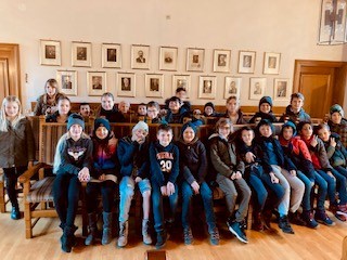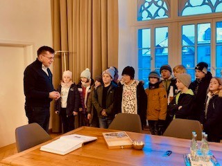 Auch Erster Bürgermeister Warmuth nahm sich viel Zeit für die Kinder und beantwortete auch viele persönliche Fragen. Er zeigte ihnen das „Goldene Buch“ der Stadt Hammelburg, in dem sich schon viele bekannte Persönlichkeiten bei ihrem Besuch in Hammelburg verewigt haben. Zum Schluss ging es für die Schülerinnen und Schüler noch in den Sitzungssaal. Hier durften die Kinder mal eine kleine Stadtratssitzung nachspielen.