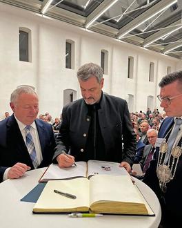 Ministerpräsident Dr. Markus Söder trägt sich ins Goldene Buch der Stadt Hammelburg ein vor den Augen von Landrat Thomas Bold (links) und Hammelburgs Bürgermeister Armin Warmuth.