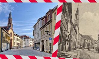 Dabei werden den historischen Ansichten jeweils Aufnahmen von 2020 - vor dem Umbau der Bahnhofstraße und von 2023 gegenübergestellt. Eine Videoaufnahme von Mai 2020 dokumentiert darüber hinaus den Zustand der Straße aus der Vogelperspektive.