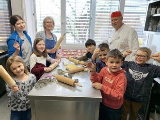 Walter Emmert, der Bäckermeister der Innung und seine Frau Elke zeigen den Kindern wie das geht! Aus nur wenigen Zutaten wird ein geschmeidiger Quarkölteig hergestellt, den die Kids ausrollen und Hasenfiguren daraus ausstechen. Wenn die Hasen im Ofen sind, heißt es: gut aufgepasst! Die Kinder beobachten den Backprozess genau, die Gebäck-Häschen bekommen ruckzuck eine goldene Farbe - ein sicheres Zeichen, dass sie fertig sind. Nun werden sie noch in Zucker gewälzt - wie lecker die schmecken!!!