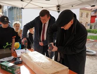 Bürgermeister sowie Bischof bohrten zusammen mehrere Löcher in ein besonderes Insektenhotel, auf dem die Logos des Bistums Würzburg und der Stadt Hammelburg eingeprägt waren. Zum Schluss trug sich Dr. Franz Jung in das goldene Buch der Stadt Hammelburg ein.