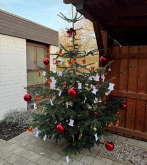 Bereits zum fünften Mal stand während der Vorweihnachtszeit im Eingangsbereich der Kita ein mit Wünscheanhängern geschmückter Weihnachtsbaum. Von diesem konnte man sich ein oder mehrere Anhänger aussuchen, die für Kinder der Kinderpalliativstation des Universitätsklinikums Erlangen vorgesehen waren. Der auf dem Anhänger geschriebene Wunsch wurde dann als schön verpacktes Geschenk in der Kita abgegeben.