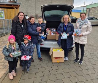 Kurz vor Weihnachten wurde so ein ganzes Auto voller Geschenke von Frau Dr. Chara Gravou-Apostolatou (2.v.r.) an der Kita von den Elternbeiratsmitgliedern Lisa Kreutzer (1.v.l.), Franziska Fees (2.v.l.) und Katja Zschernitz (1.v.r) in Empfang genommen – insgesamt haben 70 erfüllte Herzenswünsche auf diesem Weg vielen Kindern ein Lächeln auf die Lippen gezaubert.