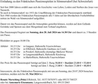 Interessierte, die die Fränkischen Passionsspiele mit uns am Sonntag, den 28.07.2024 besuchen möchten, melden sich bis 15. Mai 2024 bei Renate Marsching (Pola) Effeltrich, Tel.: 0157/30783971 oder 09133/768325 oder bei Annemarie Eisenmann, Langensendelbach,