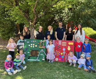 Die Healthineers wechselten innerhalb der Vormittagsstunden im Rahmen der „Volunteering Aktion 2025“ ihr Arbeitsumfeld und erneuerten unsere Fühlwand im Kita-Garten.