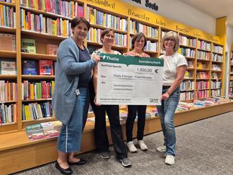 Silvia Kupfer und Karin Büttner von der Bücherei Langensendelbach nehmen den Scheck aus den Händen der Filialleitungen der Thalia Buchhandlung, Hugenottenplatz Erlangen, entgegen.