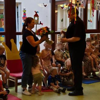 Des Weiteren nahmen wir im Juli Abschied von unserer Kita-Leitung in Elternzeit Anna Uttenreuther (früher Hack). In einem gemeinsamen Morgenkreis verabschiedeten wir Anna feierlich. Bürgermeister Siebenhaar, der stv. Bürgermeister Matthias Kern, Herr Pfarrer Roy, Kirchenpfleger Hans Singer, der Kita-Beauftragte Vitus Wagner sowie Mitglieder des Elternbeirates waren ebenso der Einladung gefolgt.