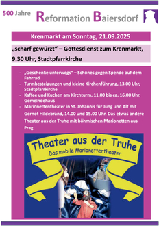 | 15:00 Uhr | Marionettentheater zum Reformationsjubiläum, Johanniskirche Baiersdorf, Baiersdorf, Am Friedhof 2 |