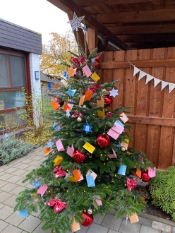 Bereits zum dritten Mal stand während der Vorweihnachtszeit im Eingangsbereich der Kita ein mit bunten Wünscheanhängern geschmückter Baum. Von diesem konnte man sich ein oder mehrere Anhänger aussuchen, die für Kinder der Kinderpalliativstation des Universtitätsklinikums Erlangen und der Organisation Toyrun vorgesehen waren. Der auf dem Anhänger geschriebene Wunsch wurde dann als schön verpacktes Geschenk in der Kita abgegeben.