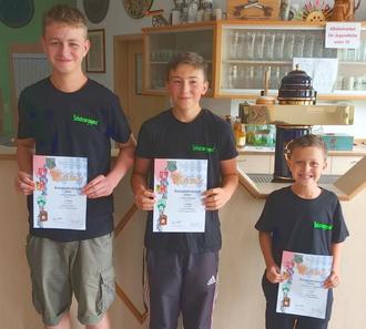 Gaumeister Johannes Fohrer und Vizemeister Vincent Wiesbeck (beide Lichtpunktpistole) und Leonhard Fohrer, 3. Platz (Lichtpunktgewehr)