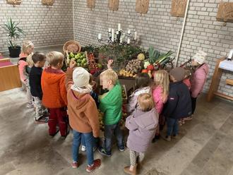 Die Kindergartenkinder und die Kinder aus der Krippe durften in der gegenüberliegenden Kirche den liebevoll geschmückten Erntedank-Altar anschauen. Die Kindergartenkinder feierten dort zusätzlich einen kleinen Erntedank-Gottesdienst.