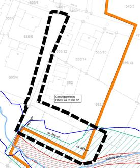Der neue Geltungsbereich wird im Bereich des Flurstücks 563 verändert und weist nunmehr eine Fläche von 2280 m² auf.
