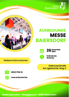 Die Baiersdorfer Ausbildungsmesse findet am Sonntag, 26.11. von 11.00 Uhr bis 15.00 Uhr in der Mehrzweckhalle Baiersdorf (Am Igelsdorfer Weg 2) statt.
