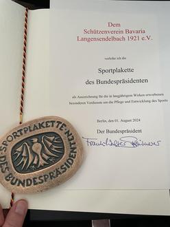 Im Rahmen eines Festakts am 30. November wurde dem Schützenverein Bavaria Langensendelbach 1921 e.V. die Sportplakette des Bundespräsidenten verliehen. Im würdigen Rahmen des Hubertusaals auf Schloss Nymphenburg in München überreichten Staatsminister Joachim Herrmann und 1. Landesschützenmeister Christian Kühn der Langensendelbacher Schützenamtsdelegation um Jan Schür (1. Vorstand), Michael Mürschberger (2. Vorstand), Hubert Derrfuß (Ehrenvorstand) und Marlies Belke (Damenleitung) die Sportplakette des Bundespräsidenten.