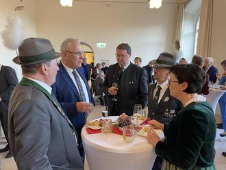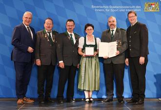 v.l.n.r.: Innenminister Joachim Herrmann, 2. Vorstand Michael Mürschberger, Ehrenvorstand Hubert Derrfuß, Damenleiterin Marlies Belke, 1. Vorstand Jan Schür und 1. Landesschützenmeister Christian Kühn