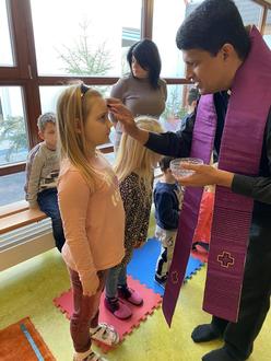 Am darauffolgenden Aschermittwoch stimmten wir uns mit Herrn Pfarrer Roy in einem gemeinsamen Morgenkreis auf die Fastenzeit ein. Jedes Kind empfing das Aschenkreuz und wir spürten, dass Gott nicht nur bei uns ist, wenn der Kita-Alltag bunt, laut und voller Leben ist, sondern dass auch in den stilleren und dunkleren Momenten Gott fest an unserer Seite ist.