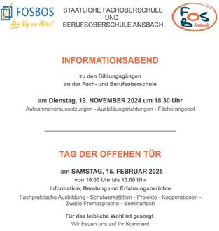 Die Online-Anmeldung ist ab 13.01.2025 unter www.fosbosansbach.de möglich. Die ausgedruckte Online-Anmeldung bitte unterschrieben und mit den erforderlichen Unterlagen in der Zeit vom 17. Februar bis 28. Februar 2025 persönlich vorbeibringen.