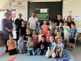 die begeisterten Kinder der Klasse 1a mit ihrer Klassenlehrerin Frau Heider (links) zusammen mit den Fachkräften vom Vitalpark und Herrn Böhmländer