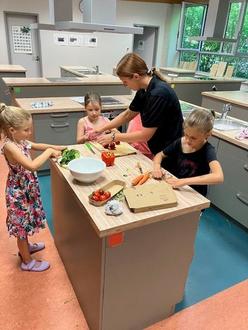 Die Schülerinnen und Schüler waren immer mit Feuereifer bei der Sache. Nach der Einheit tauschten sich die Gruppen über das Erlebte aus und ließen sich zusammen die zubereiteten Gerichte schmecken.