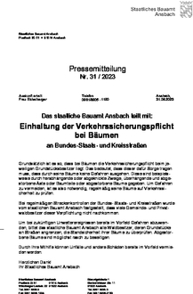 Um bei zukünftigen Unwetterereignissen bereits im Vorfeld Gefahren abzuwenden, bittet das staatliche Bauamt Ansbach alle Waldbesitzer, deren Grundstücke an Straßen angrenzen, die Standsicherheit ihrer Bäume zu überprüfen. Abgestor- bene Bäume sind möglichst rasch zu beseitigen.