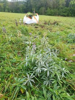Lupinenpflanzen sehen hübsch aus – im Vordergrund befinden sich die blühenden Pflanzen, im Hintergrund die Bigbags, in denen gestochene Lupinenpflanzen gesammelt werden.
