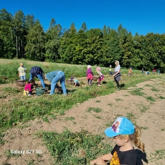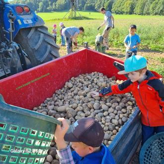 Als wir am Kartoffelacker ankamen, wurden wir schon recht herzlich von der Familie Weber empfangen. Die Kinder bekamen Körbe, um die Kartoffel vom Acker zu klauben. Nachdem alle Kartoffeln geerntet waren, holte Alex mit dem Kartoffelroder eine zweite Reihe Kartoffel aus der Erde. Alle halfen fleißig mit und hatten viel Spaß und Freude bei der Arbeit. Für die Kinder war es ein Erlebnis, zu erfahren, wie die Kartoffel von Hand gelesen wurde. Außerdem lernten sie jede Menge über die tolle Knolle: Wie sie angebaut wird und wie sie weiterverarbeitet werden.