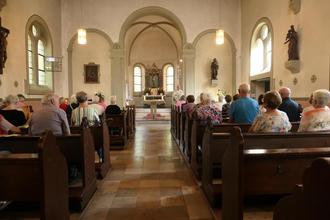 Im Walllfahrtsgasthaus „Hospitz“ wird ein leckeres Mittagessen eingenommen. Zur Freude der Teilnehmer nimmt auch Pfarrer Hans Thurn am Mittagessen teil. Er zelebriert anschließend eine Messfeier im „Käppele“ – ein bauliches Highlight. Das „Zeiler Käppele ist wie Maria Ehrenberg ein beliebtes Wallfahrtsziel. So war auch an diesem Morgen eine Frauengruppe unterwegs und erfreute sich auch an der unerwarteten Messfeier. Die Küsterin Frau Helm erzählt im Anschluss die Historie der Kirche. Danach zündet man in der nachgestalteten „Lourdes Grotte“ eine Opferkerze zu Ehren der verstorbenen Senioren an.