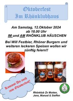 am Samstag, den 12.10.2024 wollen wir wieder unser beliebtes und zünftiges Oktoberfest im Rhönklubhaus feiern.
