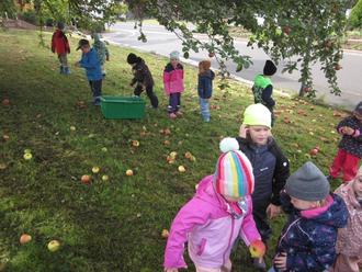 Dazu durften wir am Montag, den 13.10.2023, bei Claudia und Thomas Will in der Dalherdaer Straße Äpfel ernten. Mit Matschhose, Gummistiefeln und einem Bollerwagen mit Kisten für die Äpfel ausgestattet liefen wir los. Dort angekommen verteilten sich die Kinder auf der Wiese mit drei Apfelbäumen und fingen an zu ernten. Sie schauten sich die Äpfel genau an, damit auch nur die Guten in den Kisten landeten. Die Wiese leerte sich sehr schnell, genauso schnell waren die Kisten voll.