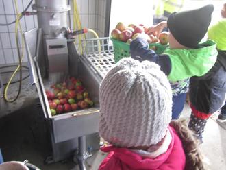 Nach erfolgreich beendeter Ernte brachten die Vorschulkinder die Äpfel am Mittwoch zur Kelterei Alfred Will nach Thalau. Da sich die Erntesaison für Äpfel dem Ende neigte, hatten wir keine Wartezeit und konnten direkt loslegen den Apfelsaft aus unseren Äpfeln zu pressen. Frau Will begrüßte uns und erklärte den Kindern zunächst, wie gesund der naturtrübe Apfelsaft ist. Sie erzählte auch, dass die Reste des Apfels nicht einfach in den Müll geworfen, sondern an die Tiere verfüttert werden. Danach begannen wir mit dem Äpfel-Pressen. Frau Will berichtete, dass die Äpfel zuerst zum Waschen in eine Badewanne kommen und anschließend über einen Aufzug in die Presse transportiert werden. Die Kinder staunten, als sie entdeckten, dass an Ende der Maschine der Saft herausfloss. Danach ging es für den Saft über eine Leitung weiter in die Destillerie. Dort werden alle Inhaltsstoffe, die den Apfelsaft schneller verderben lassen, herausgefiltert. Anschließend wurde die komplette Flüssigkeit erhitzt, um sie länger haltbar zu machen. Abgefüllt wurde in 5-Liter Behälter. Am Schluss hatten wir 140 Liter Apfelsaft. Wir haben uns riesig gefreut! Von Frau Will bekamen die Kinder noch ein Ausmalbild zum Thema Apfel.