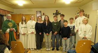 Pfarrer Krawczyk bedankt sich bei Oberministrantin Leni Herbert und Oberministrant Franz Statt für 9 Jahre. Bei Henning larbig für 7 Jahre, bei Amelie Herbert für 5 Jahre, bei Moritz Larbig für 3 Jahre und bei Hannes Larbig für 1 Jahr. Dabei bittet er Hannes Larbig nochmals seine Entscheidung zu überdenken.
