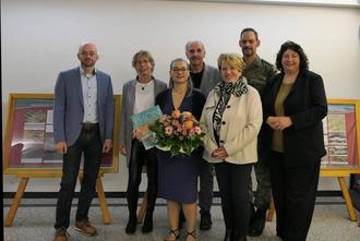 Die Ausstellung „Vergessene Dörfer – Abgesiedelte Orte am Truppenübungsplatz Wildflecken“ ist in Motten angekommen und feierlich eröffnet worden (von links): Christoph Joa vom Bundeswehrdienstleistungszentrum, Marion Stephan, Anika Link-Klinzing, Walter Kömpel, Stv. Landrätin Brigitte Meyerdierks, Hauptmann Enrico Langhärig vom Truppenübungsplatz Wildflecken, Erste Bürgermeisterin Katja Habersack.