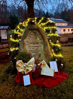 700 Jahre Gedenkstein in Speicherz und das Brückengelände im Weihnachtszauber.